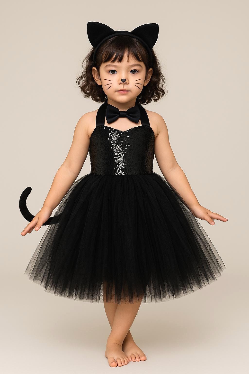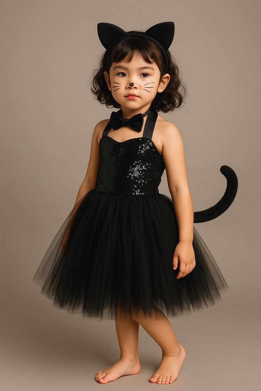 The set includes everything needed for the ultimate feline transformation — a black sequin tutu dress, cat ear headband, and a matching black bowtie. Whether it’s for Halloween costumes, themed birthday parties, dance recitals, or imaginative play, this cat dress is sure to be a favorite!