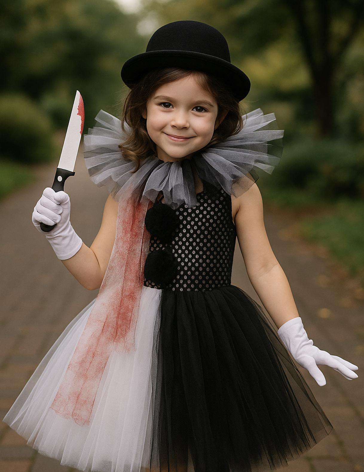 Kids Killer Clown Tutu Costume Set | Scary Circus Dress with Hat, Gloves, Knife Prop and Tights | Halloween Creepy Clown Girls Size 1-14