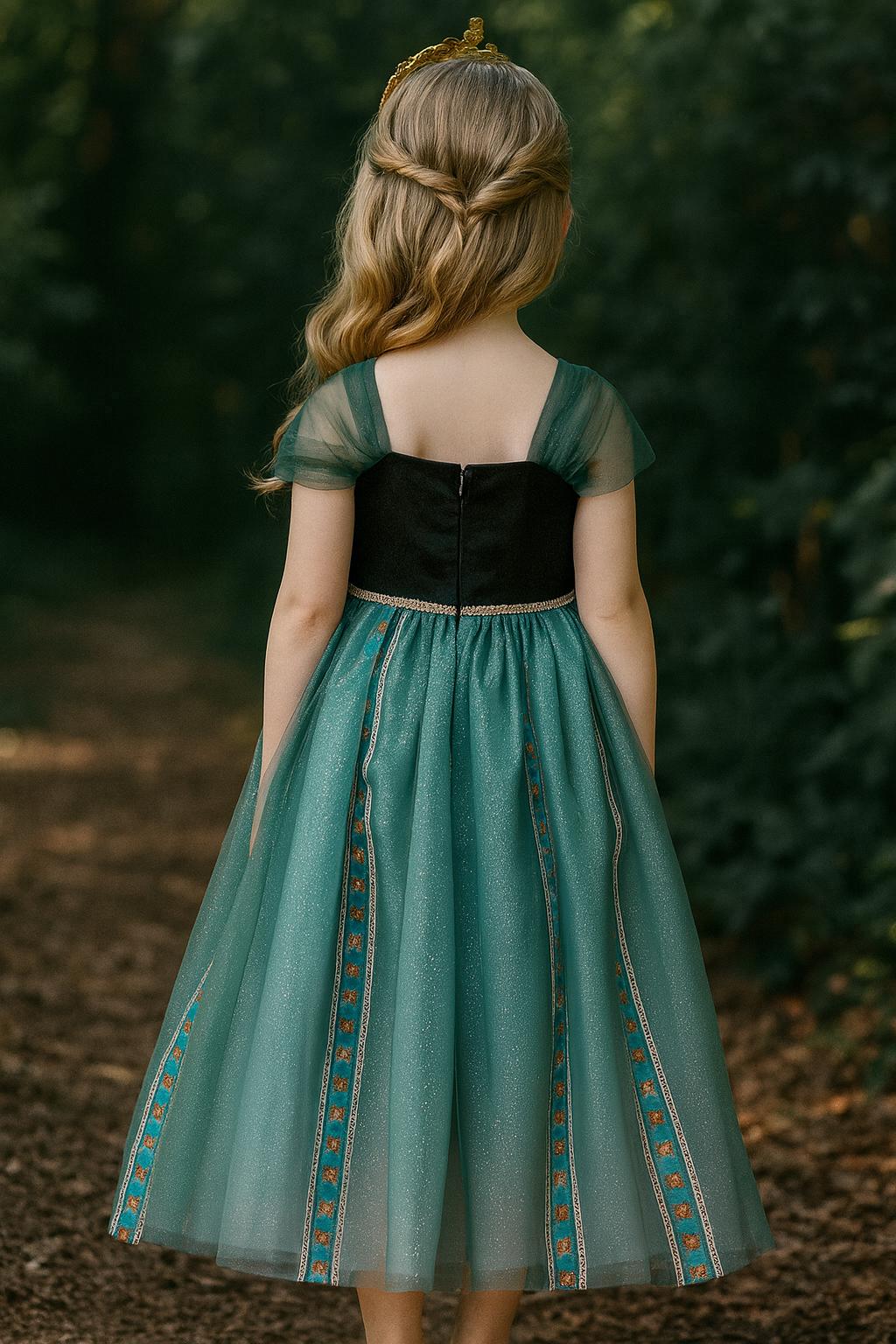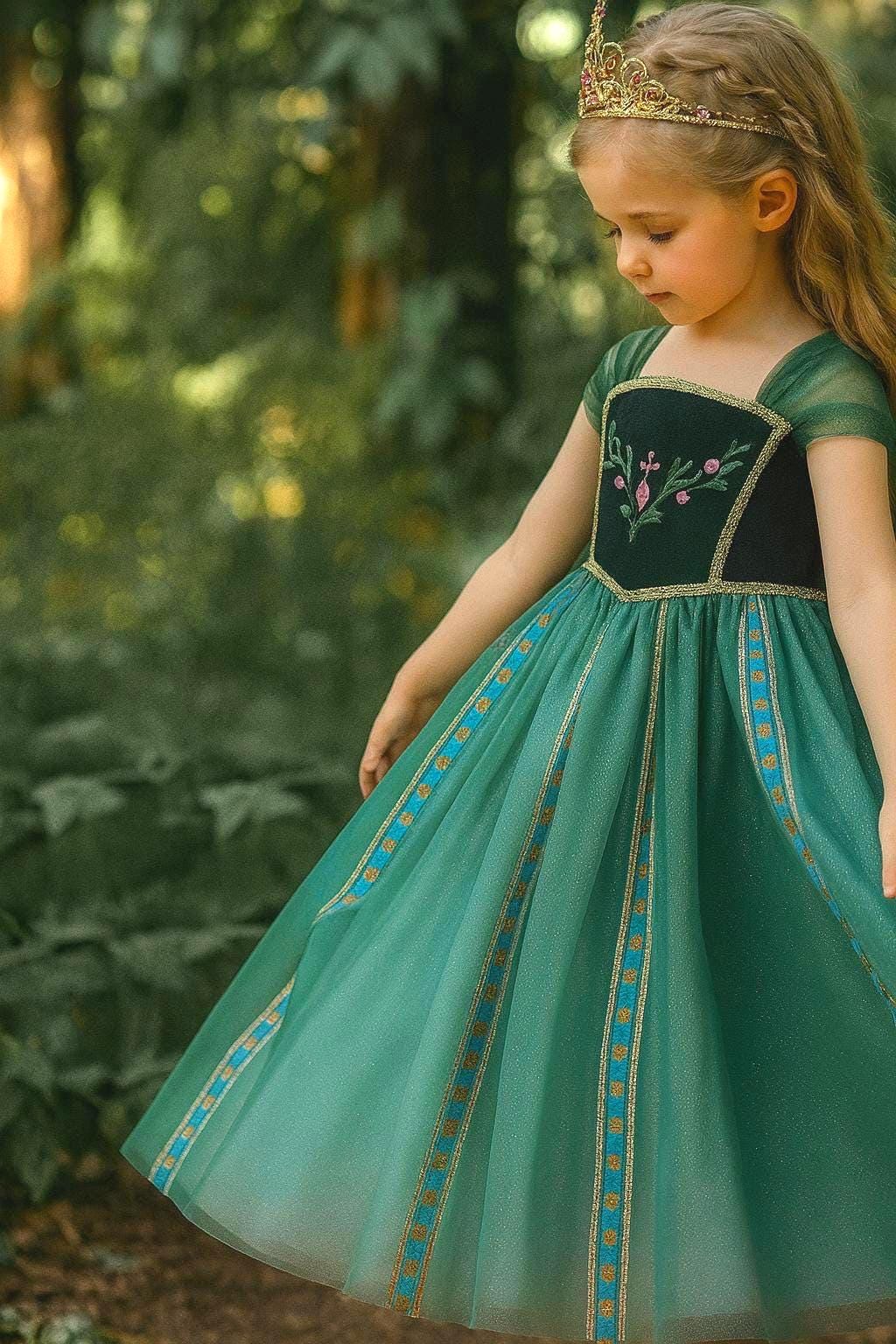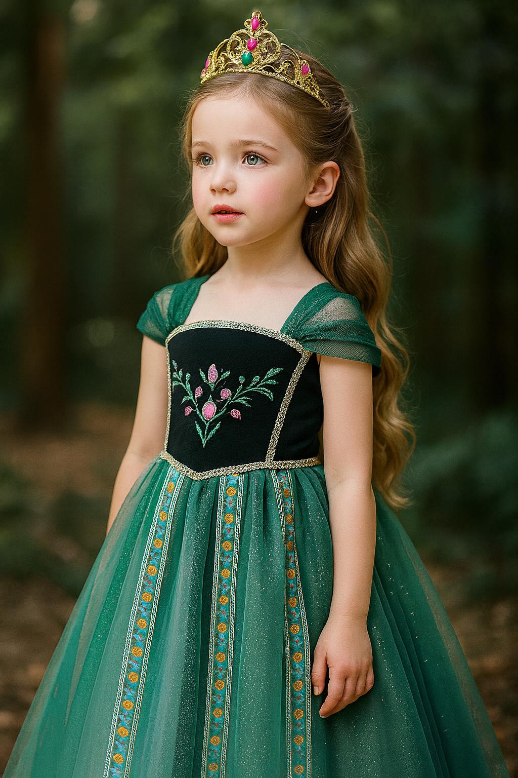 Transform your little one into the beloved Princess Anna with this enchanting green tulle dress set! 💚❄️ Featuring a beautifully embroidered bodice, flowing green skirt with floral ribbon details, and shimmering accents, this dress is perfect for birthdays, Halloween, princess parties, and magical playtime. 👑✨