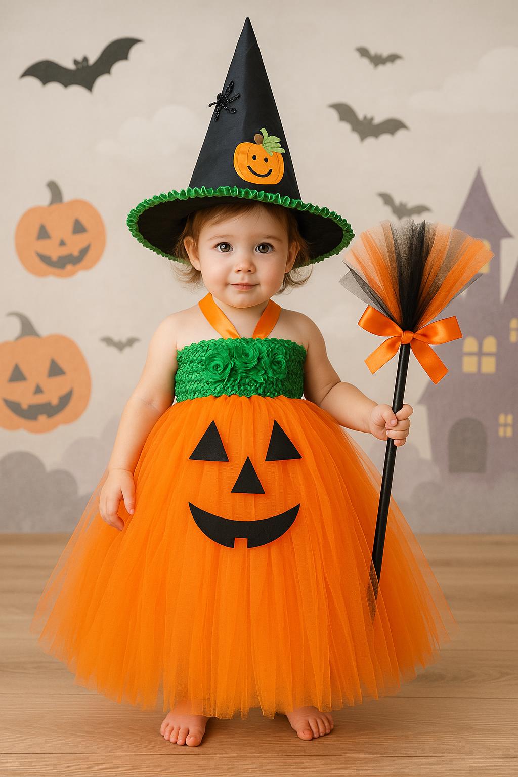 This adorable jack-o’-lantern inspired tutu dress is designed with a soft green floral bodice, layers of fluffy orange tulle, and a smiling pumpkin face detail that brings the Halloween magic to life. Complete with a matching witch hat and tulle broomstick prop, this 3-piece set is perfect for parties, trick-or-treating, photo shoots, or school events.